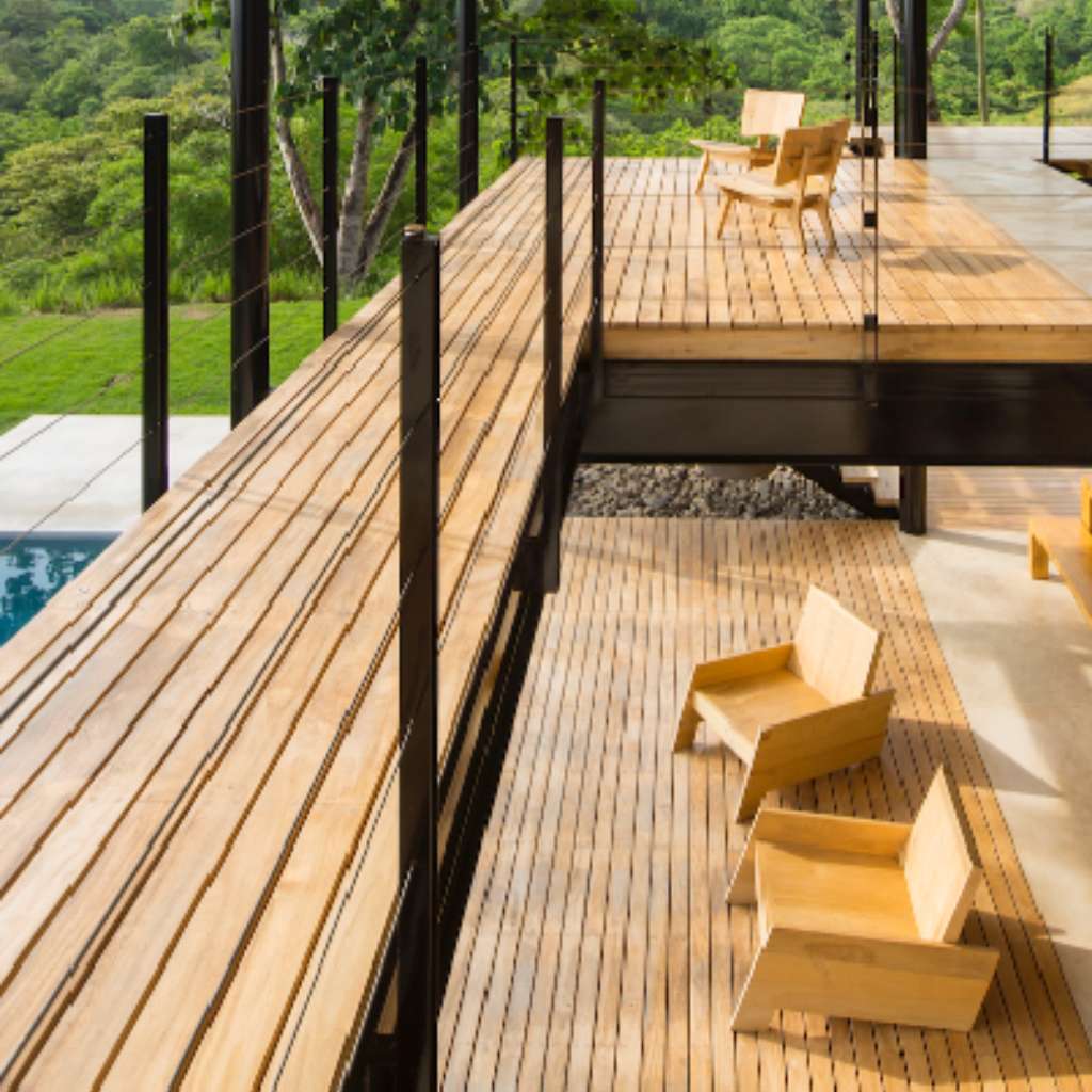 The use of decks in residential and commercial projects has evolved in recent years, not only as an aesthetic element but also as a practical solution for social areas, hallways, terraces, and wet zones. The choice of the right material depends on factors such as climate exposure, maintenance, durability, and budget. Below are the main types of decks available on the market and their technical characteristics. Natural wood has traditionally been the most widely used material. It is warm, versatile, and offers a unique finish. Thickness, width, and length can be customized, as well as edges or trims with pieces up to 12” (30 cm). In Costa Rica, the most common species are teak, melina, and almendro, sourced from certified plantations. It requires prior pest treatment, for which it is recommended to submerge the pieces in the chosen pesticide before installation. Afterwards, oil or varnish resistant to humidity and UV rays is applied. Maintenance should be performed every six months. It can be installed indoors or outdoors, fastened with top screws or hidden clips. Engineered bamboo is manufactured from bamboo fibers compressed at high density with resins and subjected to thermal treatments. It comes in pieces of 185 cm long, 14 cm wide, and 20 mm thick. It is a renewable material, highly durable, waterproof, mold- and fungus-resistant, and UV-protected. The most common colors are light walnut, dark walnut, and wenge. It is recommended for indoor and exposed outdoor areas, high-traffic social spaces, and coastal zones. It comes with up to a 25-year warranty and requires semi-annual maintenance with resealing to prevent discoloration and humidity-related degradation. The ceramic deck, commercially known as Exadeck, is made of extruded porcelain stoneware with a wood-like appearance. It is manufactured in pieces of 122 cm long, 14 cm wide, and 26 mm thick. It is thermostable, non-slip, and highly resistant to sun, rain, breakage, and abrasion, making it ideal for outdoor installations and high-traffic areas. It is available in seven colors: maple, oak, teak, antico, mahogany, natural, and grey. Recommended uses include indoor and exposed outdoor areas, social spaces, and coastal zones. It comes with a warranty of up to 30 years and requires minimal maintenance. PVC decks are made primarily from polyvinyl chloride and additives, imitating the texture of natural wood but with greater durability and resistance to weather, water, pests, and sun. Its look and feel are less natural, and it does not allow for size customization, with edges or trims up to 8” (20 cm). It is available in shades of gray, brown, and sand. This material is resistant to water, UV rays, and stains, but may present premature discoloration and unexpected contraction. Its warranty ranges between 10 and 20 years depending on the manufacturer. It is recommended for pools, jacuzzis, and coastal areas, though exposure to direct sunlight should be considered. It is not very suitable for interiors due to its artificial appearance. WPC is a composite of wood fibers and recycled polymers. Its sizes are not customizable and, like PVC, it allows trims up to 8” (20 cm). It is resistant to humidity, insects, and UV rays, although its appearance and texture are also less natural. The most common colors are gray, brown, walnut, and teak. It requires low maintenance, but it can heat up under the sun and show premature discoloration or contraction. Its warranty ranges from 10 to 20 years. It is recommended for shaded outdoor areas, high-traffic social spaces, and coastal zones, but less so for interiors where wood authenticity is desired. In conclusion, there is no “one-size-fits-all” material for decks. The selection depends on location, intended use, and the desired aesthetic. While wood provides warmth and tradition, PVC and WPC ensure durability in outdoor conditions; bamboo contributes sustainability, and ceramic offers maximum resistance. Choosing the right option means balancing technical performance, design, and long-term maintenance.